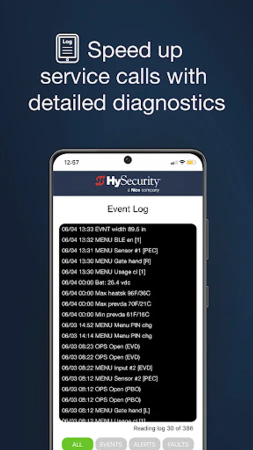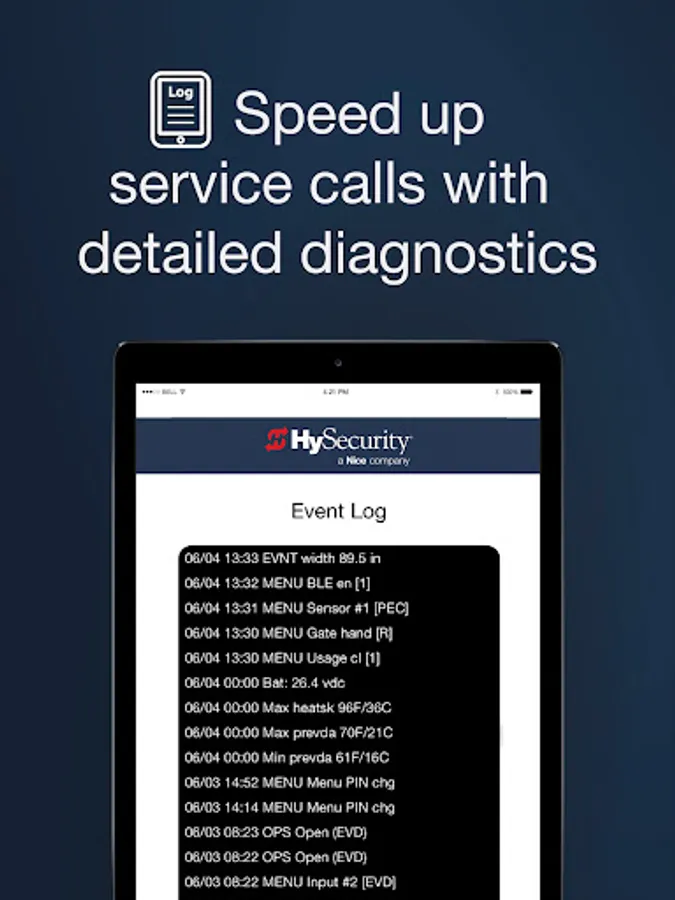 The HySecurity Installer App enables professional gate operator installers to connect wirelessly with HySecurity SmartCNX and SmartTouch 725 controllers to change settings, make adjustments, and run diagnostics. A powerful user interface makes working with SmartCNX and SmartTouch 725 controllers fast and easy. Settings can be stored, uploaded to a SmartCNX or and SmartTouch 725 enabled gate operator, and reused on other operators to speed up common configurations. Diagnostic logs can be saved and shared. It also provides fast access to documentation and installation drawings and diagrams.