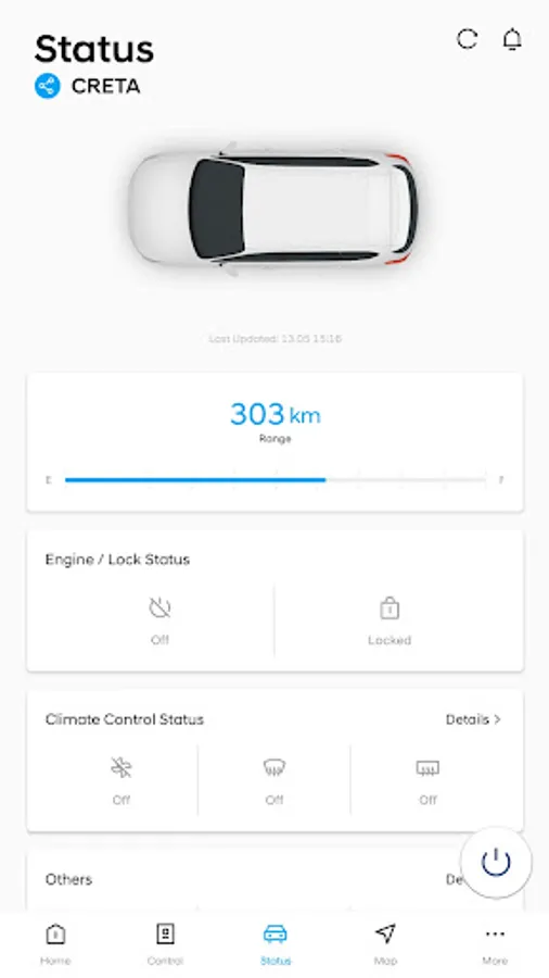 You can check the status of your car, such as the engine on/off, AC on/off, doors open/locked, hood open/closed, tire pressure and fuel indicator via the Bluelink application.