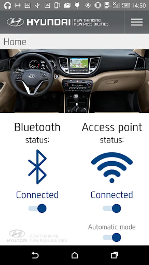 The Hyundai Access Point App automatically switches your smartphone’s hotspot on when using your Hyundai car, thus establishing a connection with your navigation system.