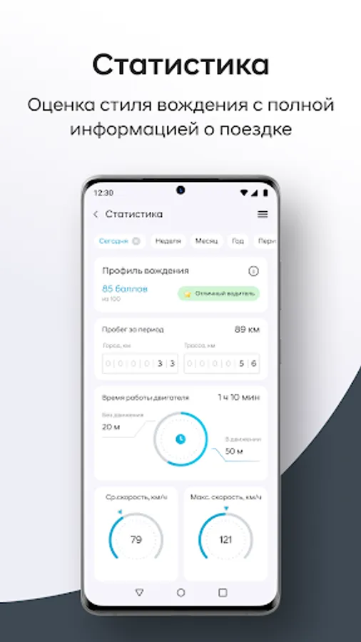 - Operating statistics (number of hours in driving mode, in parking mode, average and maximum speed, assessment of driving style).