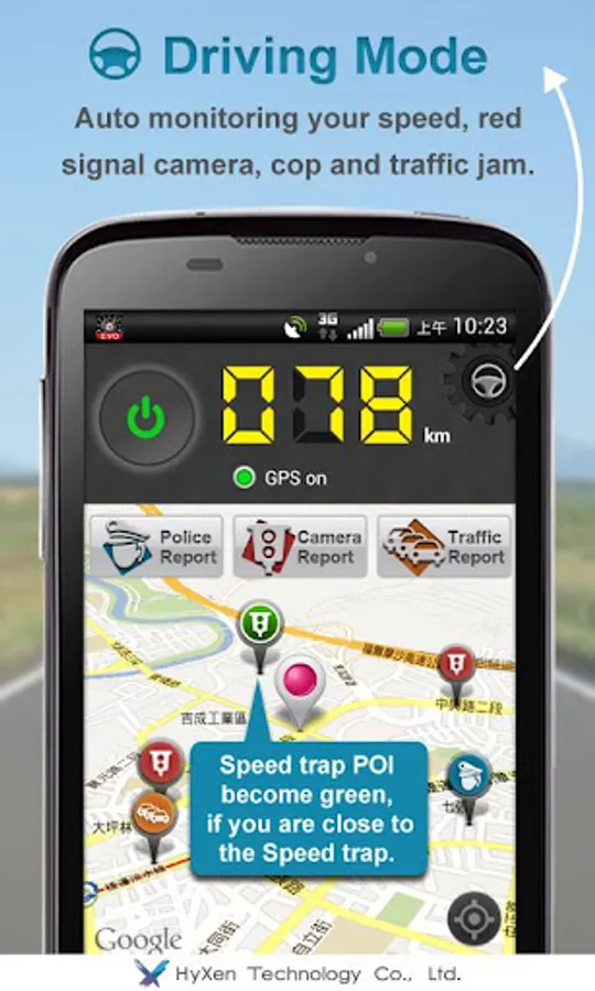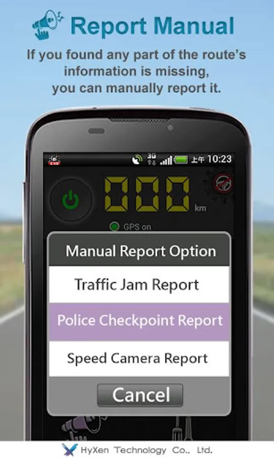 Driving Mode: Traffic report, Police report, Camera report, Traffic check, and Over speed alert(please click "setting/over speed alert" to set speed).