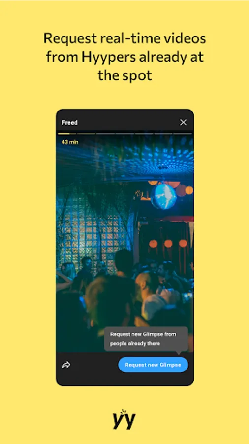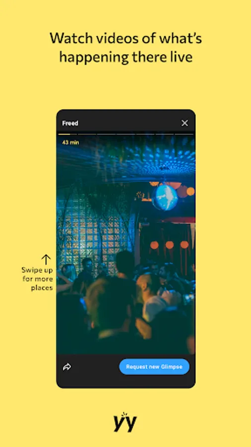 Glimpses are short videos associated with a place (bar, restaurant, venue, cafe) where a user can have a quick glimpse of what's the vibe like in the specific place. The user can view multiple Glimpses from the same place in order to have a better understanding of what's happening. Some Glimpses are within the last 2 hours and some are from the same day previous week in order to get an idea of what's about to happen later the same day.