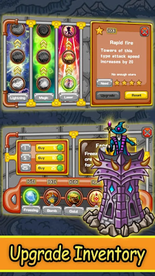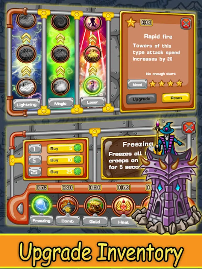 · Match the kingdom tower with the arms restraint relationship, upgrade the skill tree, use critical strike, AOE, freeze, bomb... Use a variety of excellent collocation to make the enemy immobile, so that the line of defense as solid as gold.