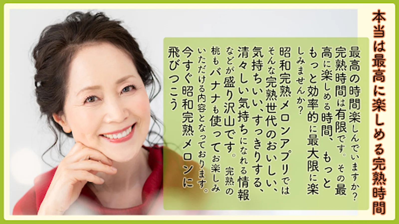 Everyone in their 40s, 50s, 60s, 70s and above, thank you for waiting. I may have kept you waiting too long. The Showa Ripe Melon App that we have also visited before you. Please enjoy your meal as soon as possible. The time to enjoy the ripe Showa melon is short, and the ripe generation has a finite amount of time to spend the most enjoyable time. . . Dive into the world of fun now. Just install it now.