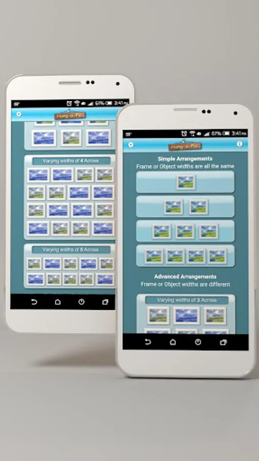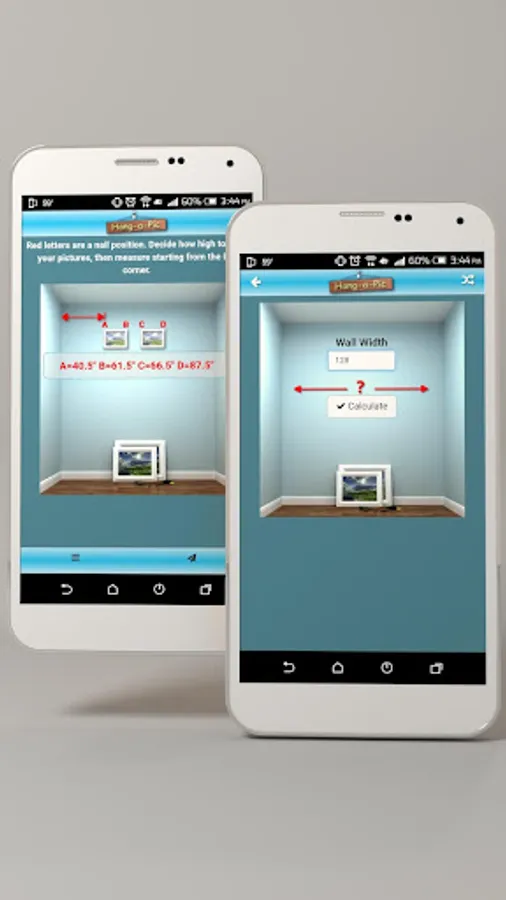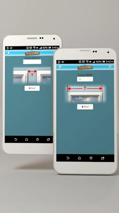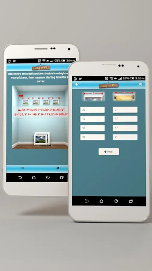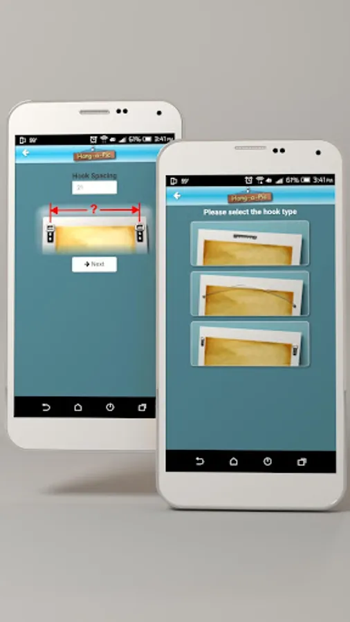Hang-a-Pic greatly simplifies the tedious and sometimes difficult task of hanging multiple, equally aligned pictures, mirrors, decorative plates, candles or any other wall mounted ornaments. Of course, hanging one picture is simple. But if you have anywhere from 2 to 5 pictures, each with two hooks on the back, and you want them exactly 6 inches, or 15.24cm apart, and aligned correctly across your wall? Hang-a-Pic will do just that! You can choose your measurement preference in the Options menu.