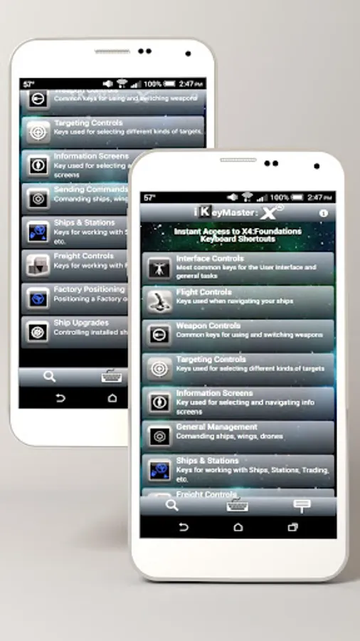 iKeyMaster:X4 Foundations App is a handy reference tool to have on-hand while playing X4:Foundations. iKeyMaster:X4 contains the entire set of the latest X4 Keyboard Shortcuts Reference and makes them instantly available from your Android device. Just tap iKeyMaster:X4 and the latest X4:Foundations keyboard shortcuts are instantly available for you.