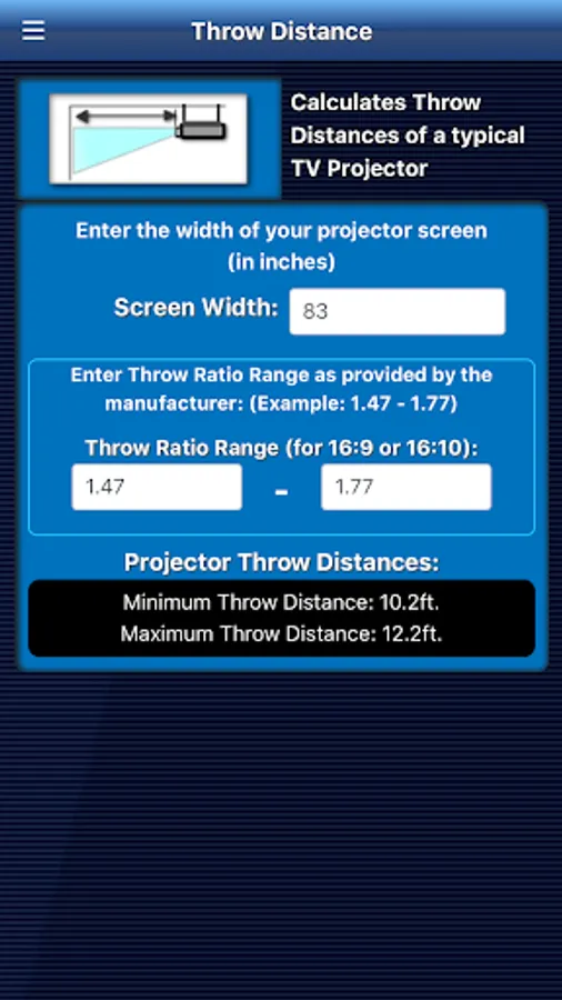 TV-Tools can calculate Optimal Viewing Distances for your new TV, give you the Optimal TV sizes for a given room, calculate TV screen dimensions by Aspect Ratio, Diagonal size, Width and/or Height! That might come in handy when trying to figure out if that new 60-inch HDTV you have your eye is the right fit! If you're considering the really BIG stuff like a Projector, TV-Tools can also calculate the Throw distances for typical Home Theater TV Projector. This would help figure out where a Projector would need to be mounted if you were thinking about getting a 100-inch wide screen.