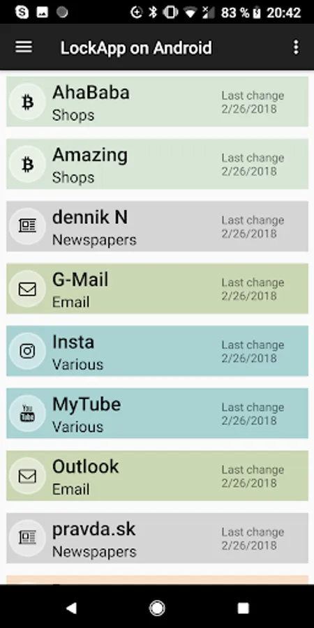 Main feature of LockApp is its storage, which safely holds all your secrets in one secure place. LockApp encrypts and protects not only your passwords, telephone numbers addresses and so on. You will not need to remember many of complex passwords. Your master password or a PIN is all you need. With possibility of storing links to websites it also provides a defense against phishing. LockApp can also generate secure passwords and even a history of passwords is maintained as well. Backup and restore data through your personal OneDrive account is also provided as standard. With possibility to add unlimited accounts (paid) you are able to share selected secrets with your family or with team members. The switching between accounts is easy and secure.