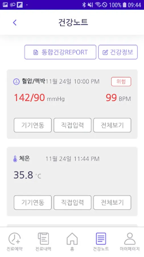 블루투스로 연동 가능한 측정기기가 있다면 자동으로 데이터가 입력되어 통합관리가 가능 합니다.