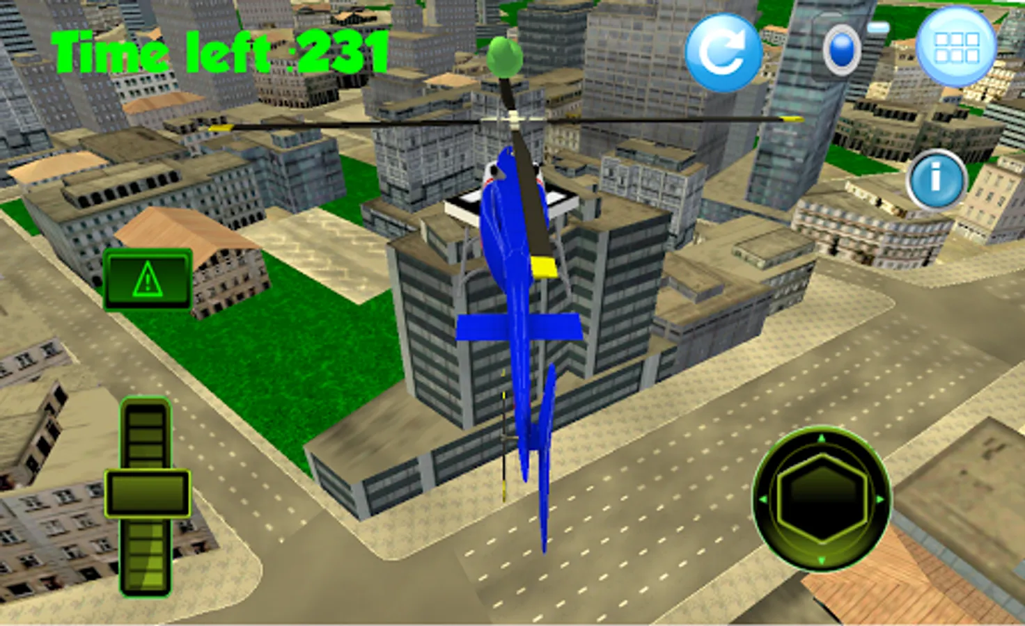 City Helicopter Game 3D takes you on a flying adventure through the city skyline in this helicopter flying simulation game. Become the best helicopter pilot and fly through the city, making your way to the designated helipad where you must land the helicopter to complete each of the 20 exciting levels in this helicopter flight simulation game. Be careful when flying the helicopter to avoid hitting into the skyscrapers or you crash and have to retry the level and fly safer.