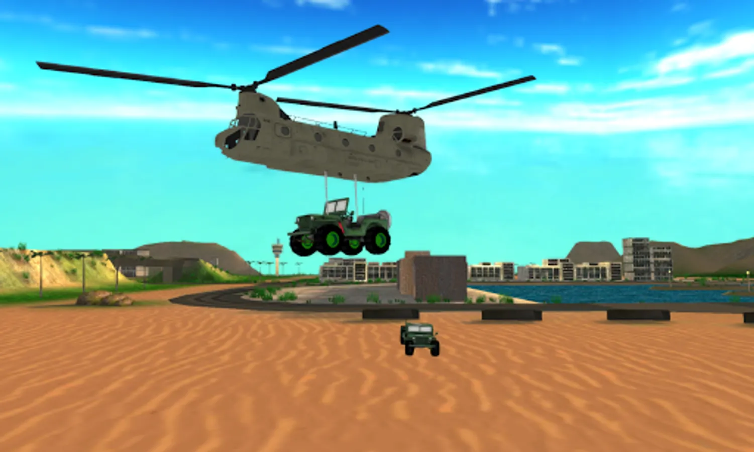 Helicopter game, Helicopter Flight Simulator 3D, is a new a exciting helicopter flying sim game. Take control of a super realistic Chinook army helicopter and go on top secret flying missions around the tropical islands ! ALL 20 LEVELS UNLOCKED, DRIVE JEEP MODE, AND SANDBOX MODE !