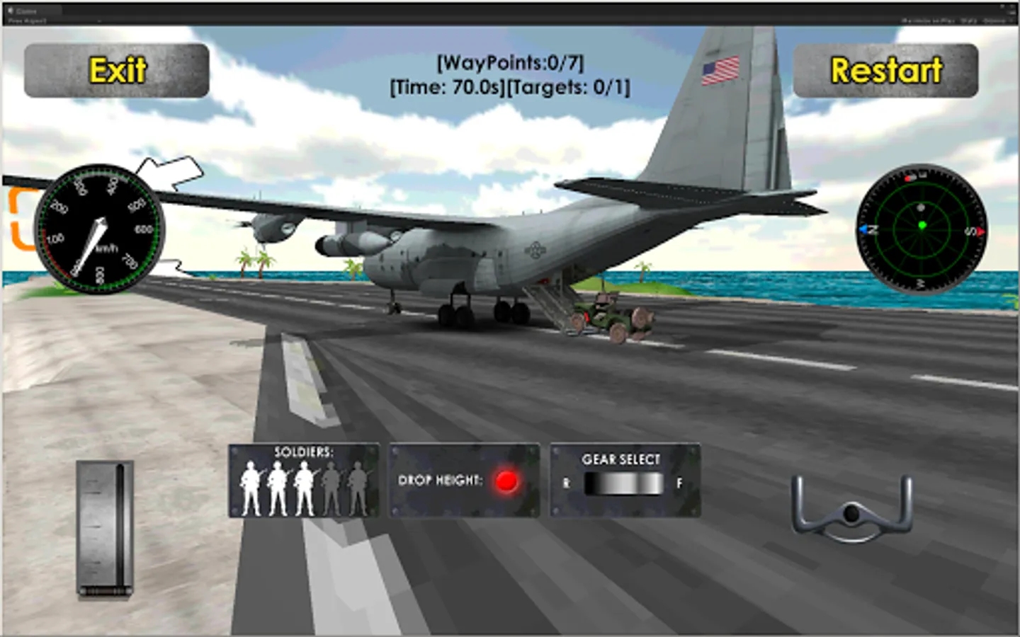 Flight Sim: Transport Plane 3D is a brand new 3D Plane Simulator Game! Your mission is to fly an army transporter jet, board the soldiers and vehicles onto the plane and drop them off at the correct destination, fly through the waypoints to ensure you stay on course and drop the soldiers inside the dropzones.