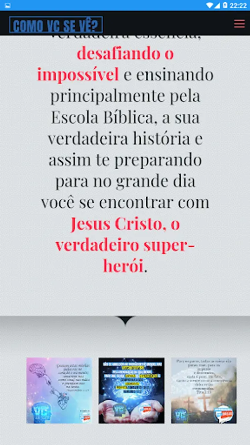 As you see yourself, it is a movement that will teach you to seek your true essence, challenging the impossible and teaching mainly through the Bible School, its true history and thus preparing you for the big day to meet Jesus Christ, the true super- hero.
