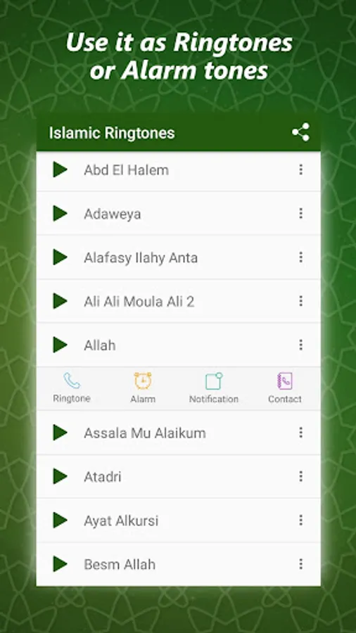 We also added ‘religious songs’ also some Famous Duaa,arabic islamic tones, Ramdan tones and Islamic Notification ,so you can enjoy the beautiful Islamic ringtones.