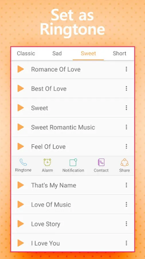 Romantic ringtones app is free collection of most popular romantic songs and music as unique Love Ringtones which you Can use as ringtone, notification, alarm, or assign to a contact and much more.