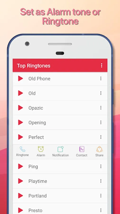 Top Ringtones is a colletion of 100 most popular ringtones, Top 100 ringtones includes variety of styles of sound effects like stunning 3D surround sound, beautiful pop music, funny comedy effects, happy holiday ringtones , love ringtones and The latest personalized ringtones. You can play them and set as your default ringtone, notification, alarm, or set as contact ringtone by just single click.