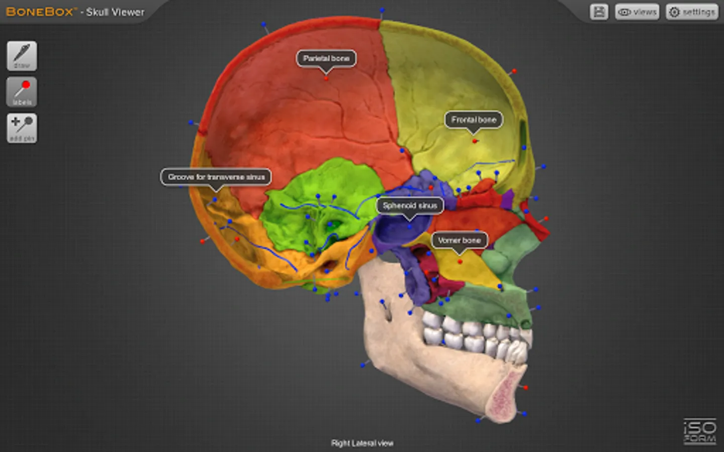 • Quizzing: The BoneBox™ Skull Viewer an excellent tool for any anatomy lecture or lab. Using the custom pin tool, instructors can place color-coded pins anywhere on the skull. Once placed, the instructor can write a question on the label of that pin. Students can then rotate the skull in 3D to gain a better understanding of that pin’s location on the model.