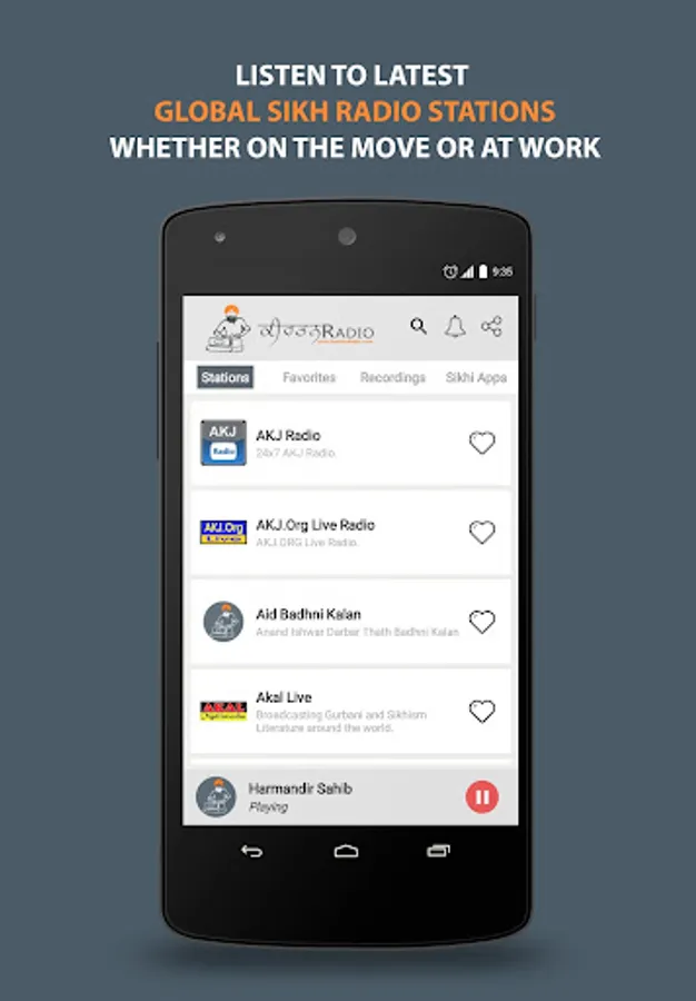 Keertan Radio | Listen to Keertan from Global Sikh Radio Stations right on to your Android Devices. Whether on the move or at work, you won't be far away from the Guru's Shabad from the Hub of Universal Oneness.