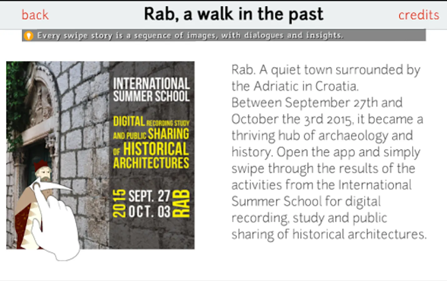 The first episode was made during the International Summer School for digital recording, study and public sharing of historical architectures, held in Rab (Croatia) between September 27 and October 3, 2015 with the participation of teachers and students.