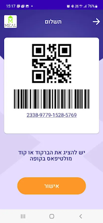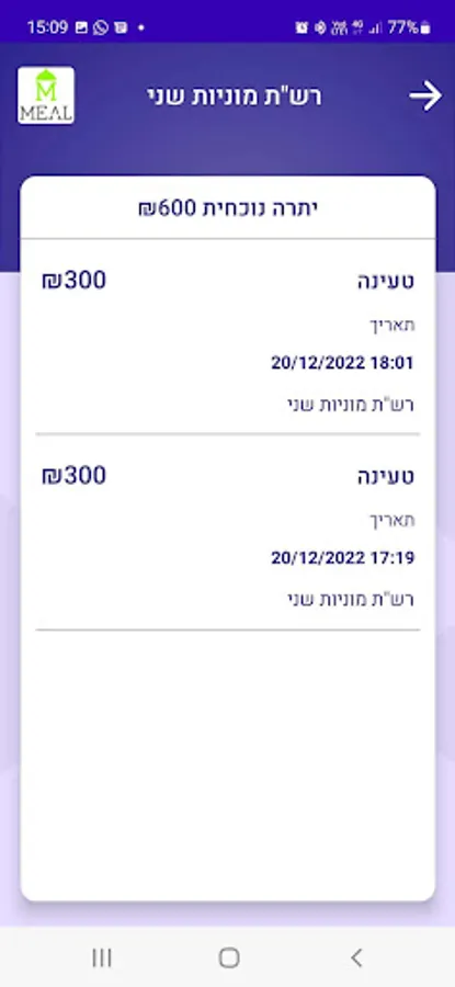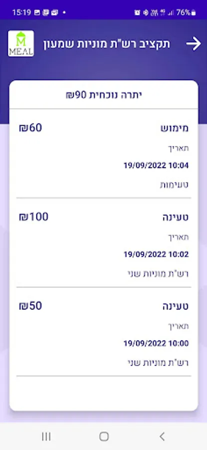 The wallet shows the balance of the budget given to the contractor employee, previous transactions, and enables fast, easy and safe payment in the various restaurants