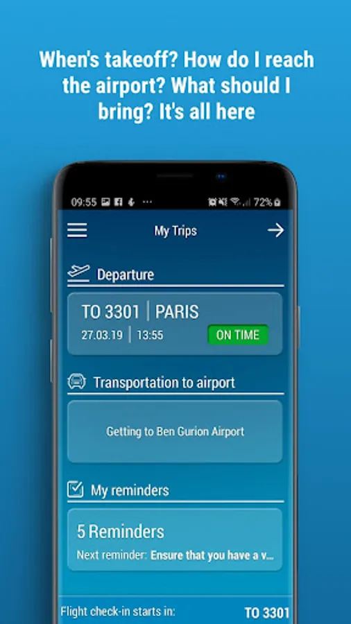 The Ben Gurion International Airport app (TLV) is an official cellphone application, developed by the Israel Airports Authority, for your convenience. With this app, you can discover all the information you need before even reaching the Ben Gurion Airport , as well as throughout your stay at the airport.