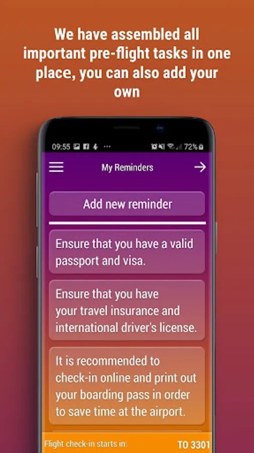 • Enter personal tasks that will help you remember what you need to do and receive suggestions for tasks to perform before your flight.