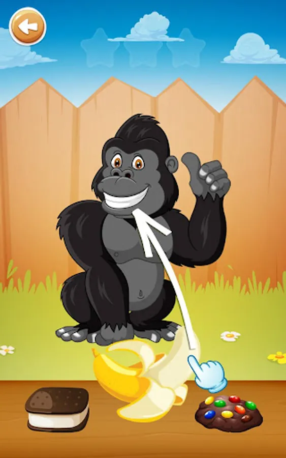 3. Learn what animals eat by choosing the right food from the table. Does the mouse eat cheese or watermelon? Does the gorilla eat banana or cake?