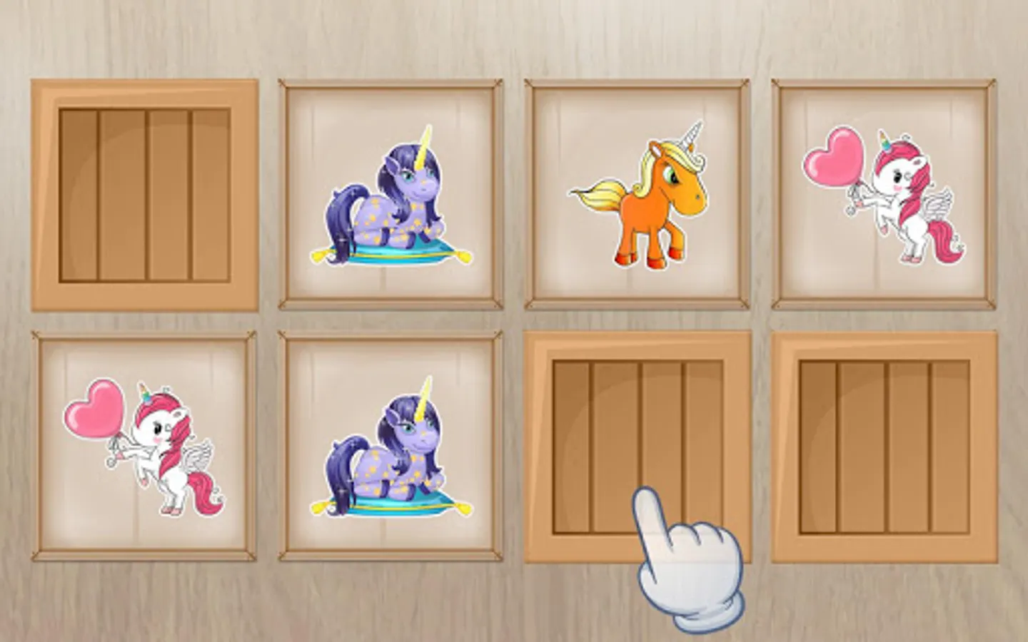Memory game – A game with increasing difficulty, find the pair of unicorns in a grid of 4, 6, 8 and 12 wooden blocks.