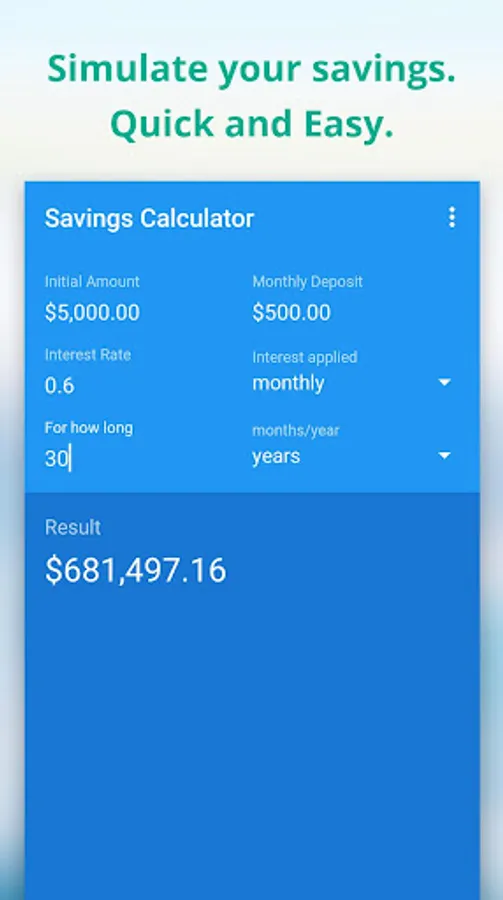 You will be able to simulate how your investment will grow over time by changing the monthly depositsinterest rate, initial amount and period of investment as well.