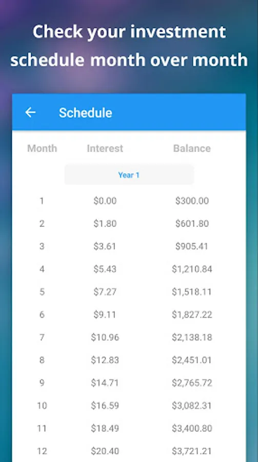 Check the investment schedule to see in a simple table how your savings will grow month over month and how much you will earn with compound interest.