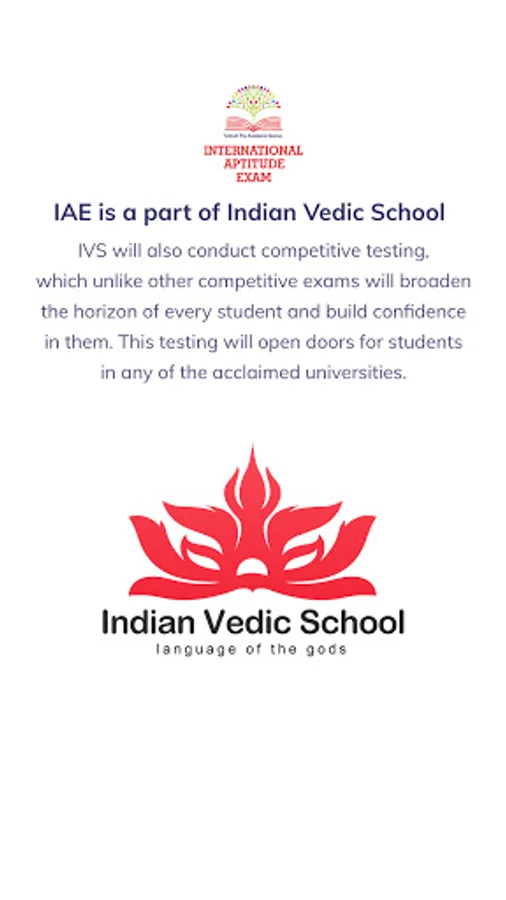 Indian Vedic School (IVS) now offers school students the opportunity to showcase their skills and knowledge against the best of India and indeed the world. It conducts competitive testing, unlike other competitive exams IAE will broaden the horizon of every student and build confidence in them.IAE offers deserving school students the ability to check how good they are in subjects such as Math, English, Science, Computers, Social Studies, Vedic Sciences, Vedic Math and General Knowledge.