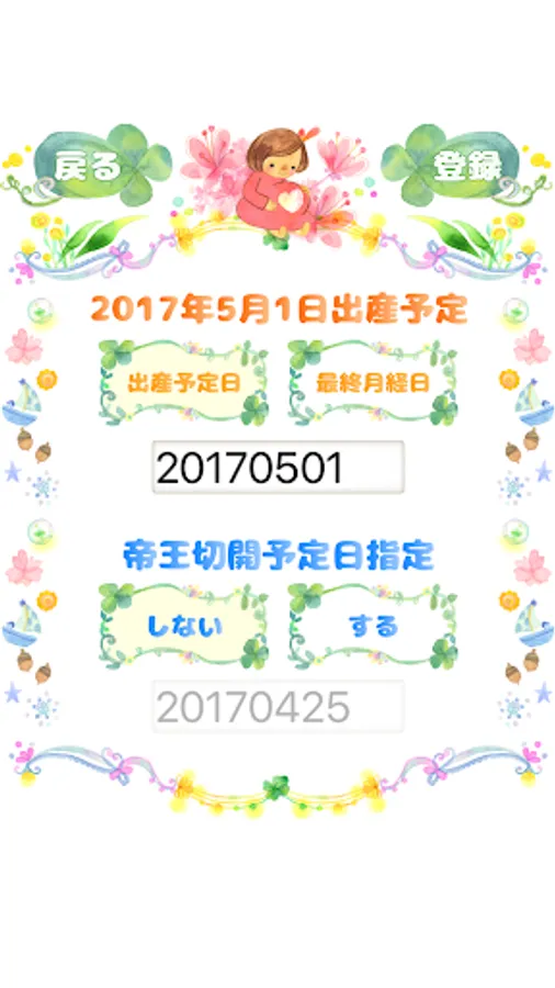 出産予定日・最終月経開始日・帝王切開予定日から、妊娠週数・妊娠月数・出産予定日(または帝王切開予定日)までの日数を自動的に計算します。簡易メモカレンダー付き。