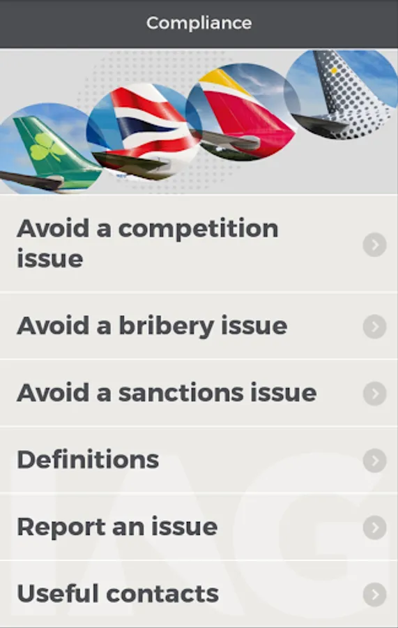 International Airlines Group (IAG) legal compliance app. Provides helpful information and guidance concerning common workplace compliance issues.
