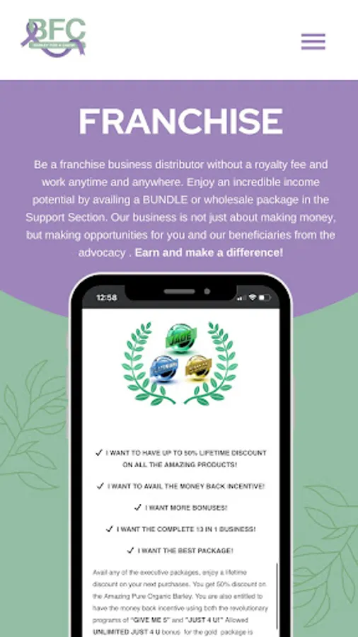 Earn and make a difference! Our business is not just about making money, but making opportunities for you and our BFC beneficiaries. By availing a bundle or wholesale package and by joining BFC’s passionate team, you have the option to become an authorized distributor and enjoy an incredible income potential. It is also our goal to foster a culture of generosity with a business model focused on helping all distributor partners and uplifting the lives of BFC beneficiaries.