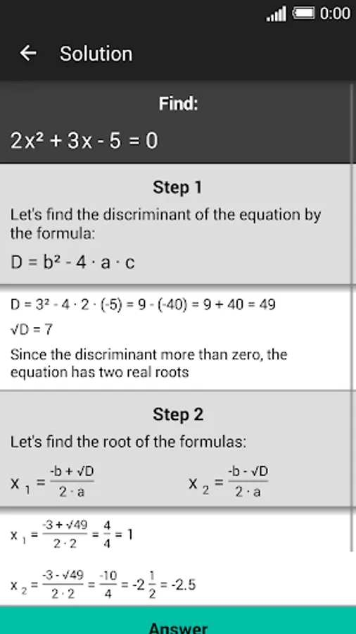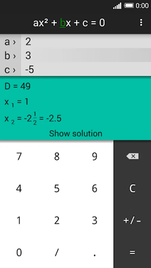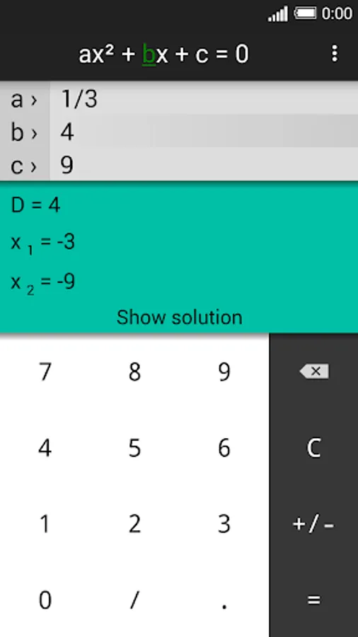 QuadCalc+ is a program that enables to solve quadratic equations and view detailed process of their solving. It can work both with common and decimal fractions as coefficients. The program is very easy to use and has the oportunity to find complex roots of an equation.