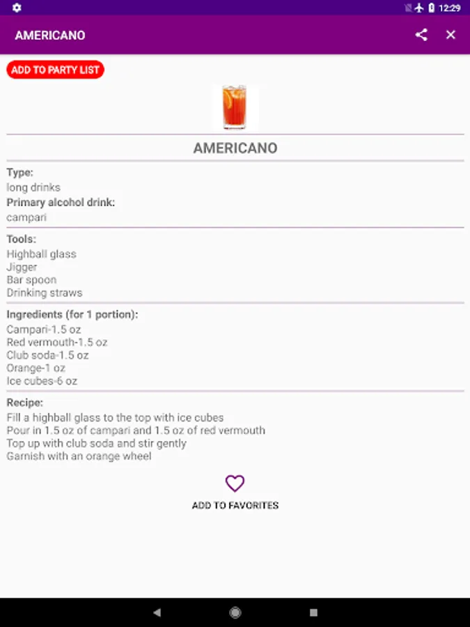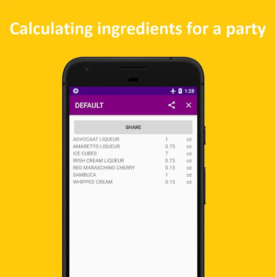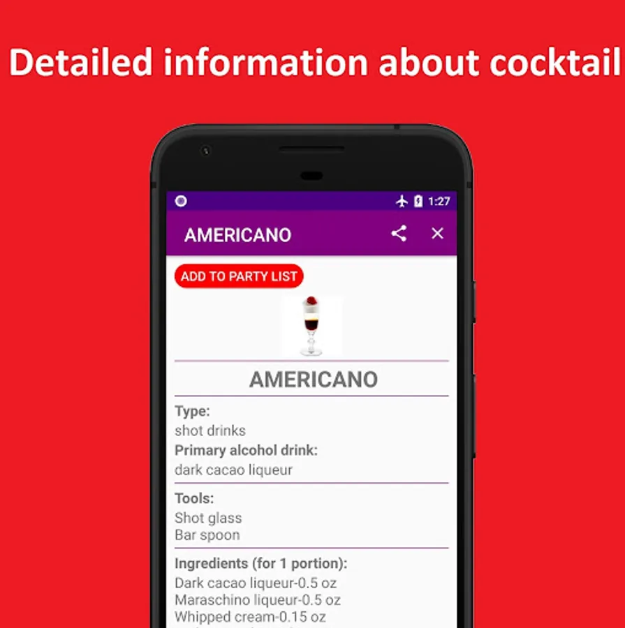 ✓ Party Planner. The Master which helps in calculating the number of necessary ingredients for the preparation of selected cocktails and party organization.