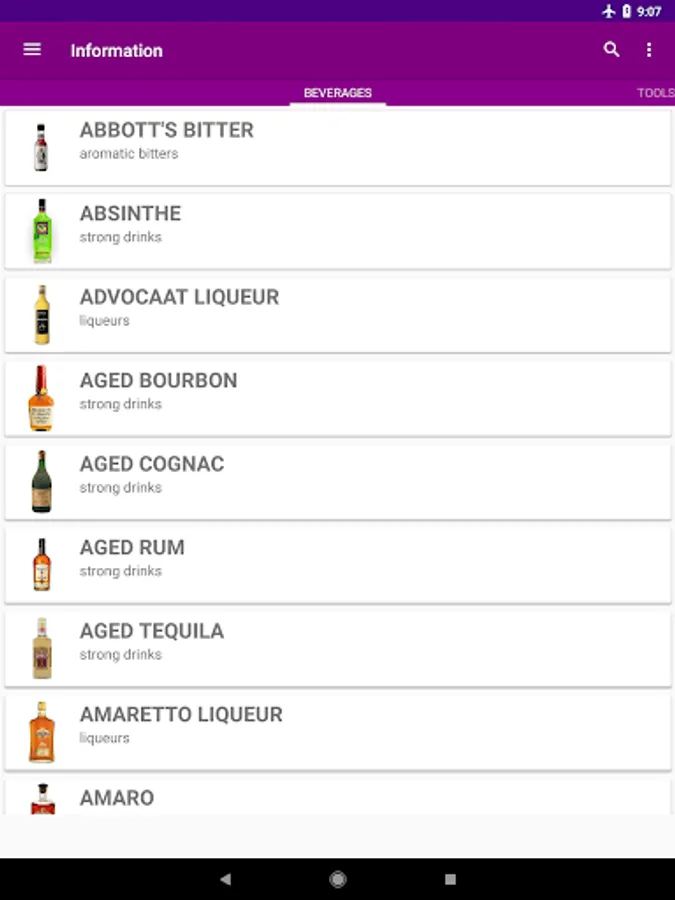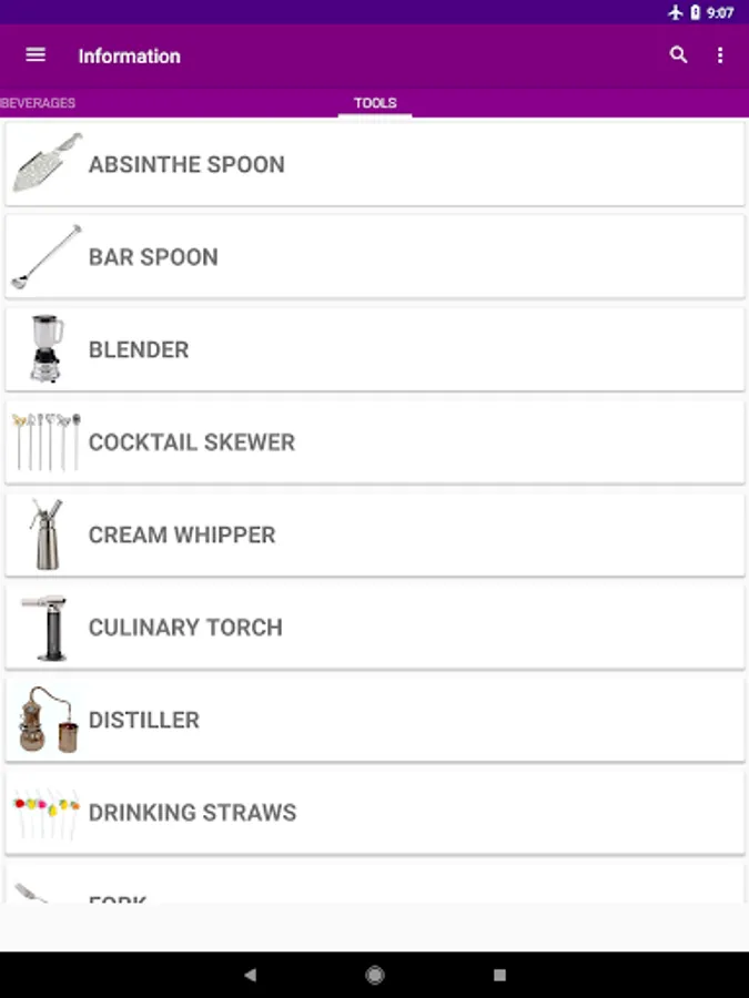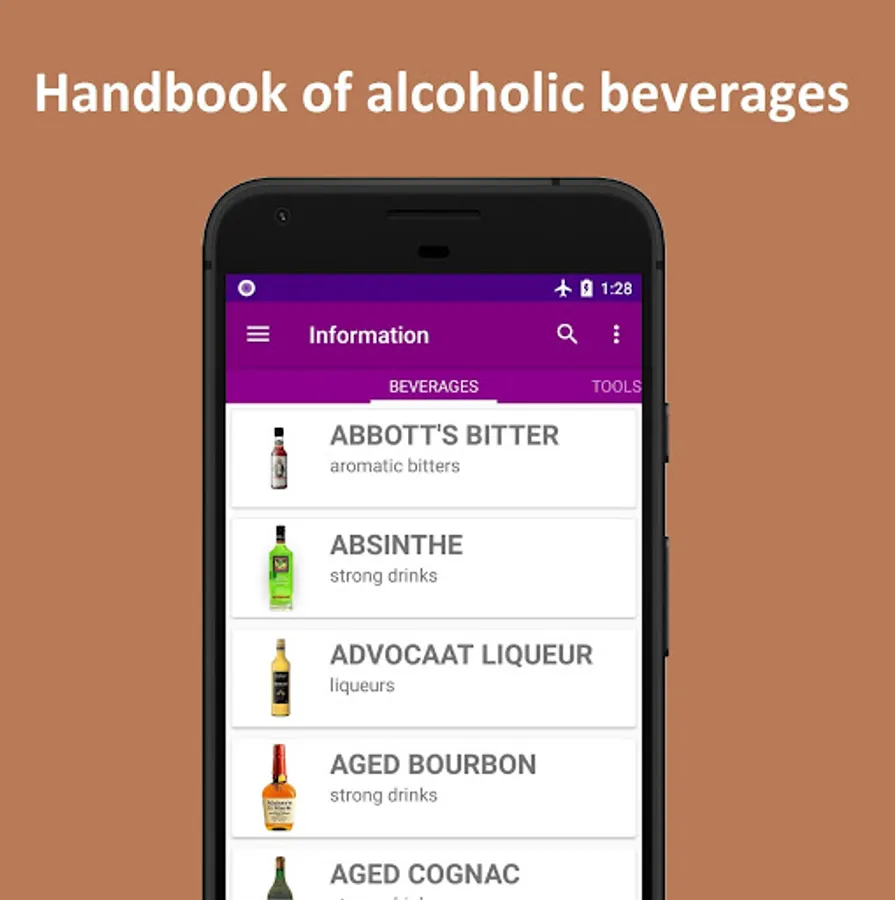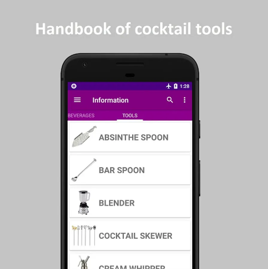 ✓ Information Reference section which contains information about alcoholic beverages and accessories used for the preparation of cocktails.