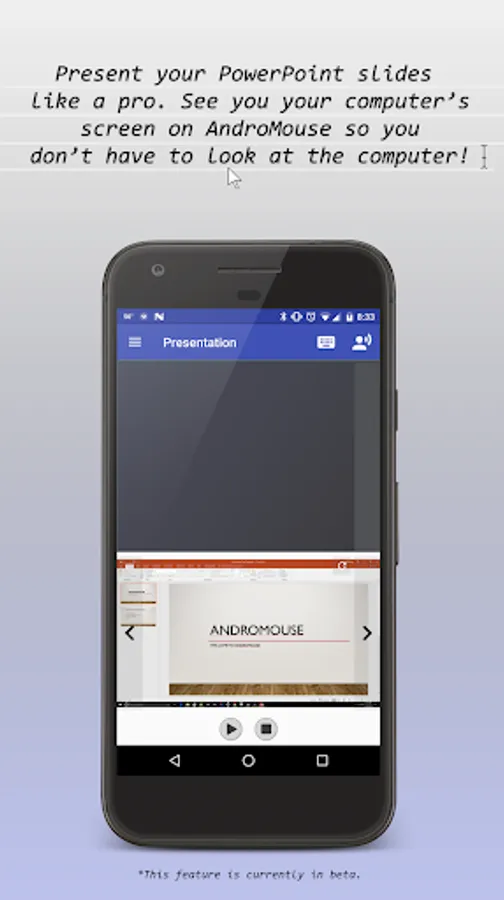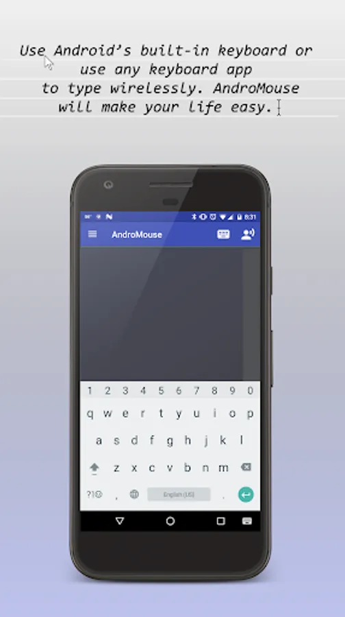 The best and the original remote Android mouse and keyboard out there. AndroMouse converts your phone into wireless mouse, keyboard, and more. Connection with your computer is made either using your existing wi-fi or using Bluetooth. AndroMouse also features speech-to-type which uses Google speech recognition to make your work easier.