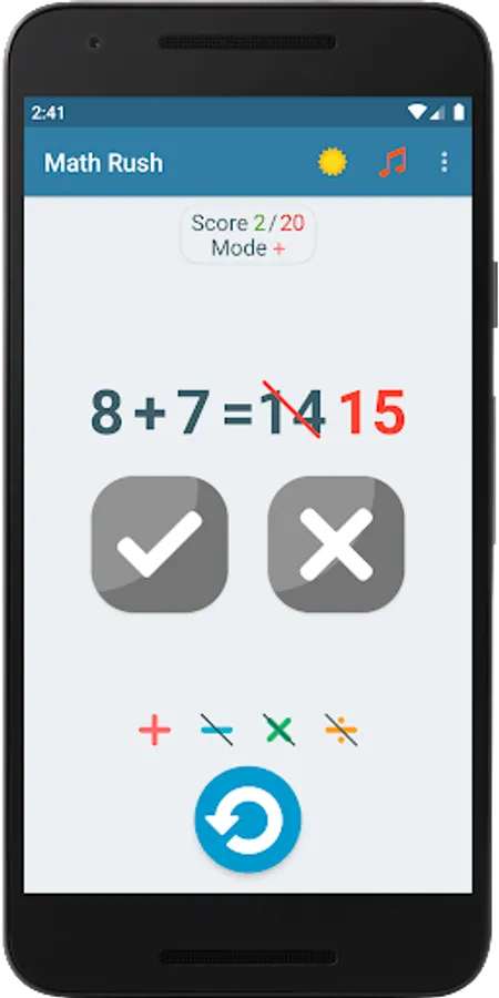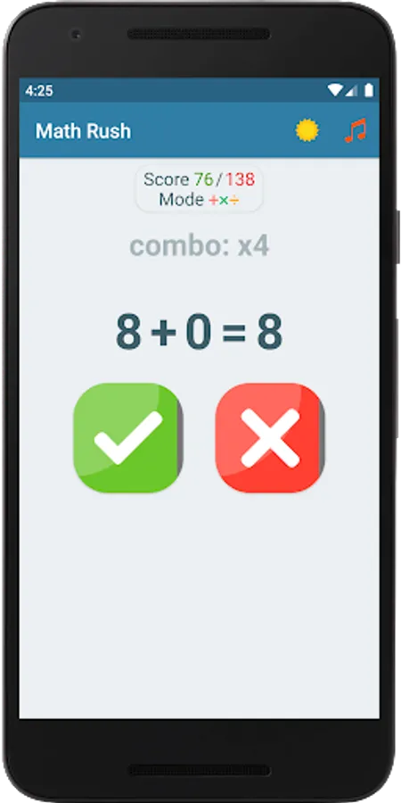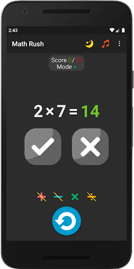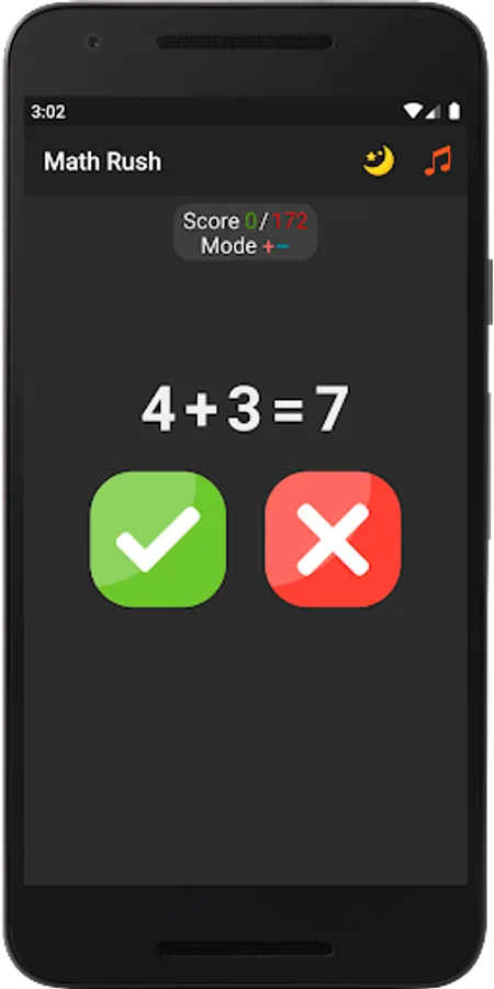 This game will allow you to train your brain, keep your mind in constant tone, develop memory and thinking. In the game, you yourself choose which examples you want to practice. For example, if you want to learn the multiplication table, then just choose examples with multiplication and play with them and the multiplication table will learn by itself, and if you fall behind in division, just choose the equations with division and play with them and you will not notice how quickly you will master division. The game has 15 modes with different combinations of equations; for each game mode, maximum points are saved, by which you can constantly observe your progress and surpass it. The game provides two themes: day and night, so that you can play comfortably at any time of the day. For great interactivity, entertainment and involvement in the game, it has a soundtrack that you can turn on or off at will.