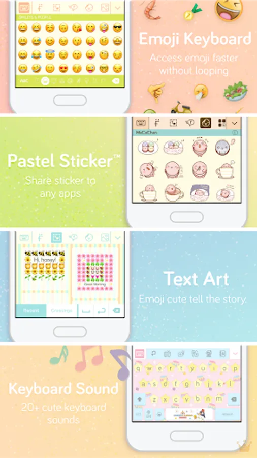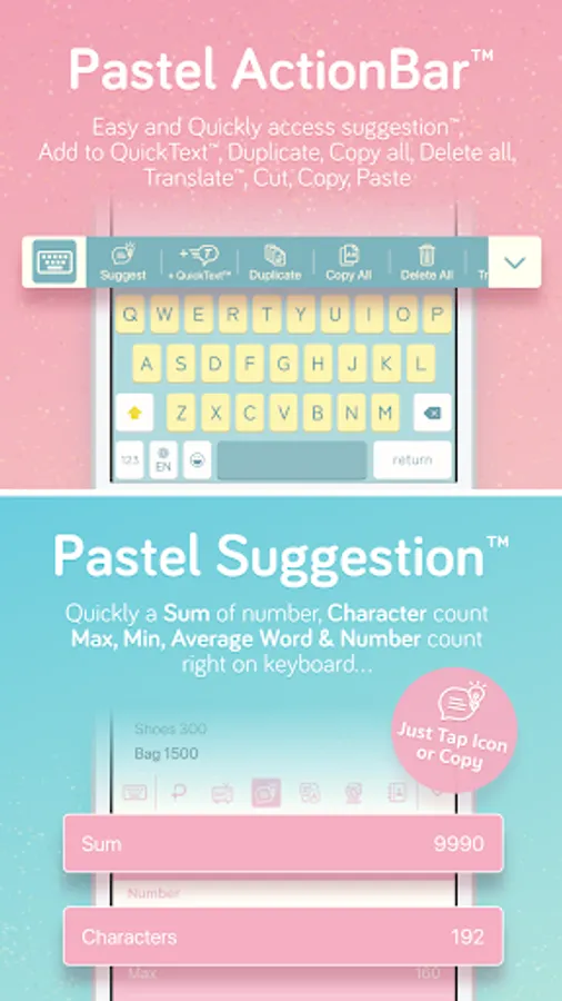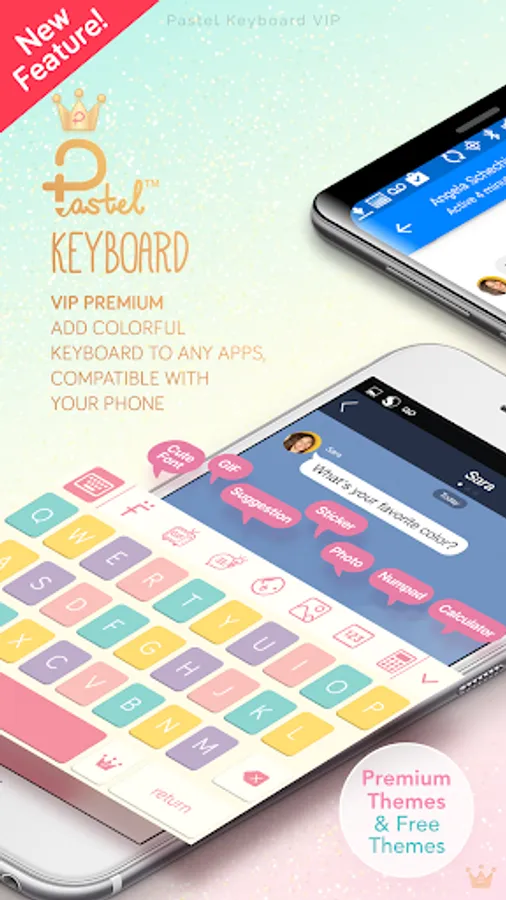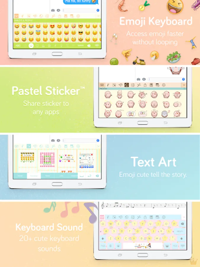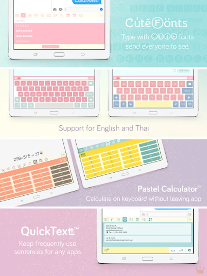 Meet our feature!! Cute Fonts 100+ premium fonts make fancy sentences and send to the one you care about,QuickPhoto™ Share your photos everywhere. Pastel Sticker™Calculator on the keyboard and Numpad.