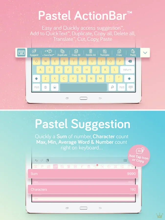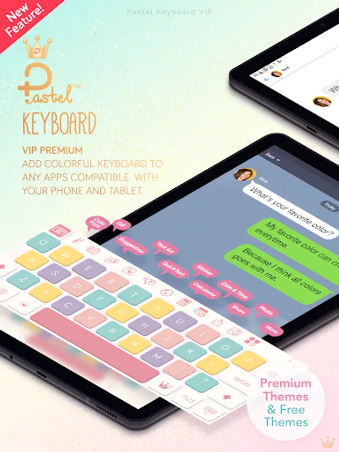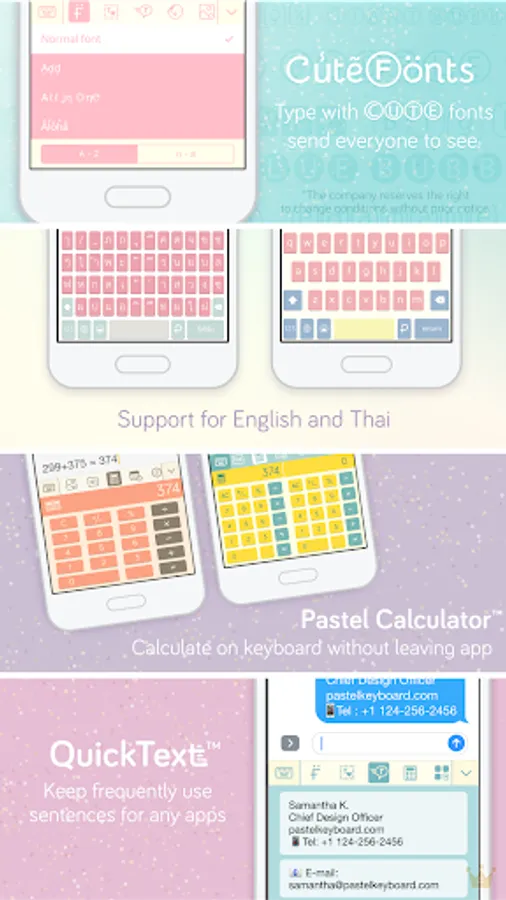 Meet our feature!! Cute Fonts 100+ premium fonts make fancy sentences and send to the one you care about,QuickPhoto™ Share your photos everywhere. Pastel Sticker™Calculator on the keyboard and Numpad.