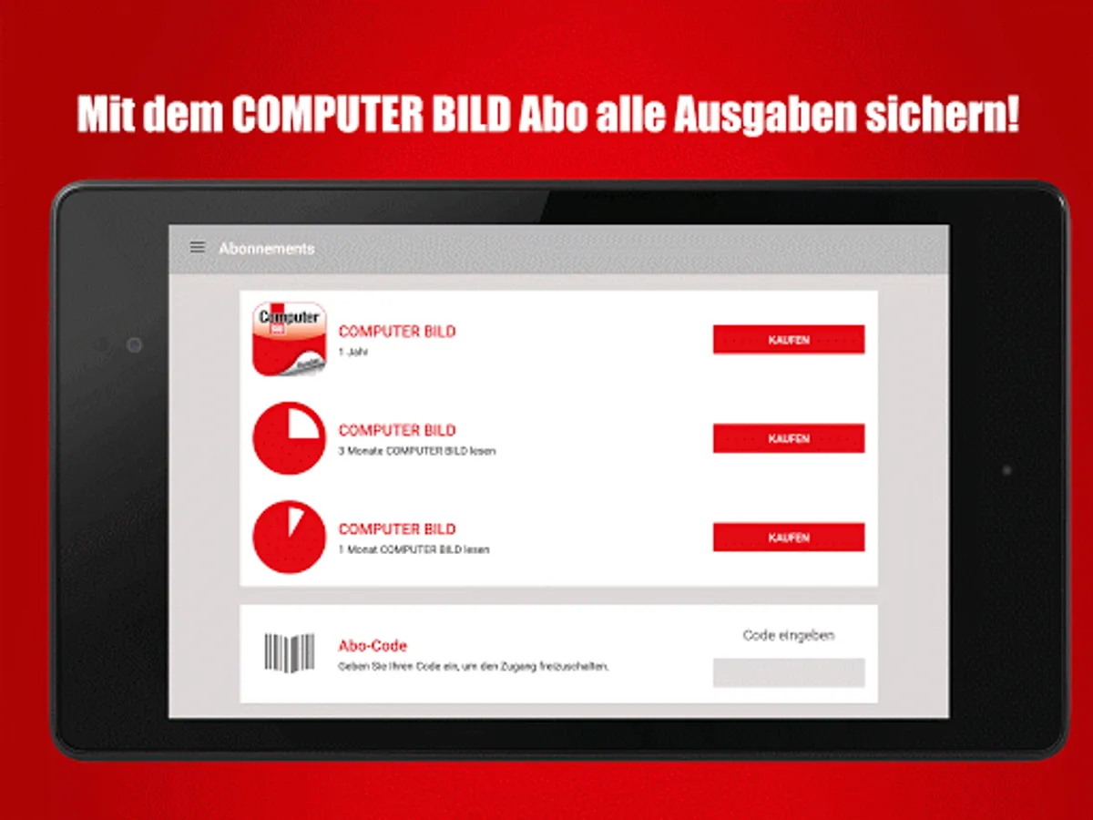 * Not all contents of the printed edition (issue-DVD, reader actions on benefit code, software downloads via Advantage Code) are included in the app. If you want to request a benefit code, please send an e-mail stating the issue and action to tablet@computerbild.de.