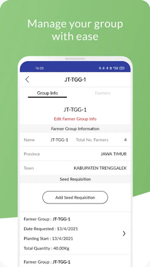 Our application interface is simple and easy to use and enables you to organize your Farmers into Farmer Groups.