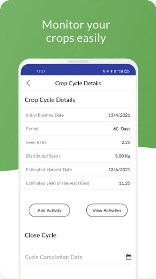 Add Plot, Crop Cycle and Activities to monitor the progress of the farm through our application.