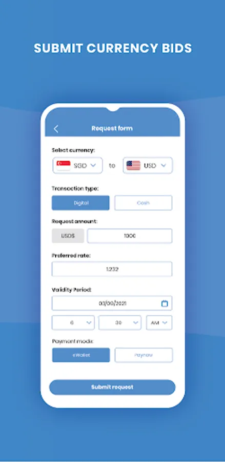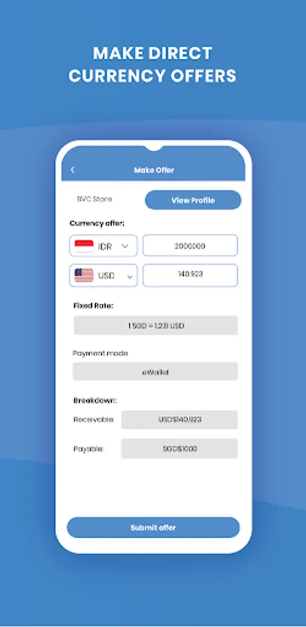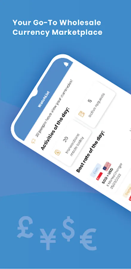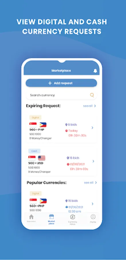 Trading currencies in the app is easy and automatic. Money Changers can trade with either digital or cash currencies with the best rate available.