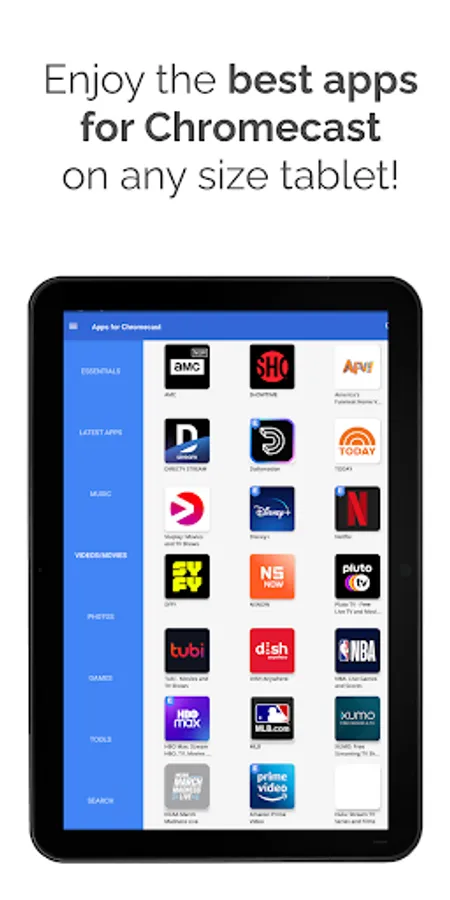 • Browse our categories full of apps ready to cast to tv: Movies, Music, Photos,Games, Tools and Essentials.