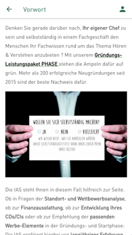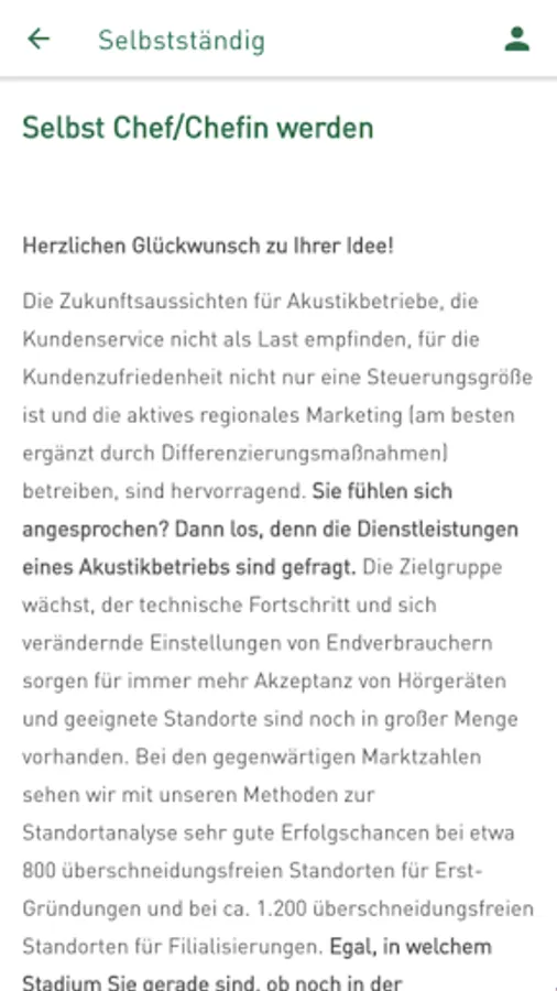 Do you work in the hearing acoustics industry and are you thinking of starting your own business? With this app, we offer interested start-ups a manufacturer-independent and free advice service - regardless of which phase of business start-up you are in. With our individual services, we have already supported over 100 successful start-ups in hearing acoustics - get started now!