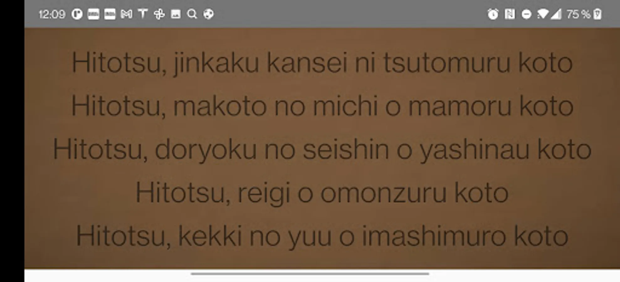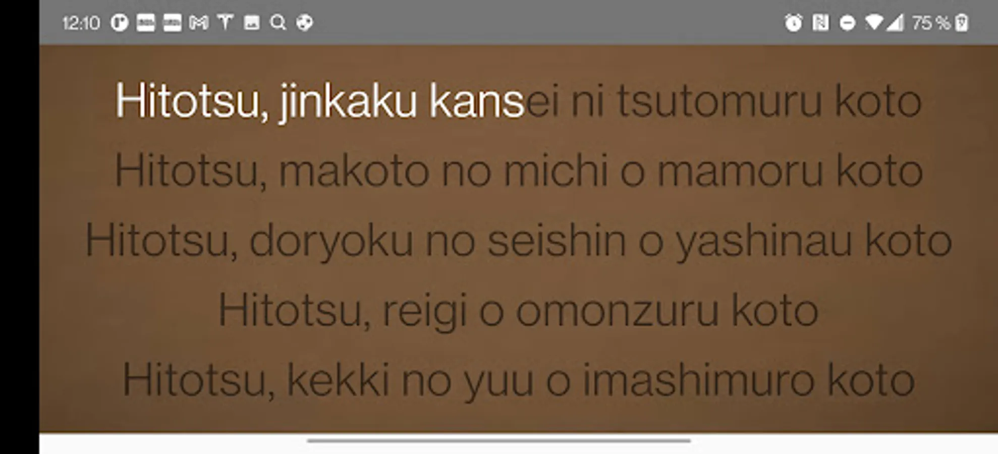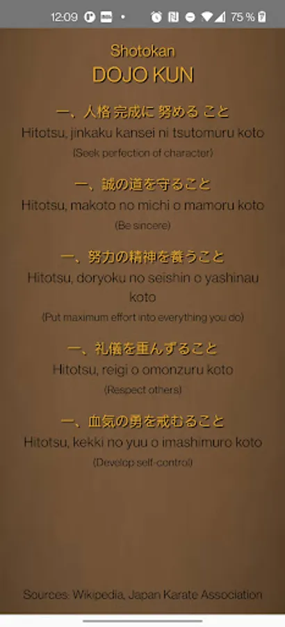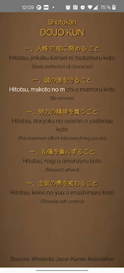 This simple and useful app helps you learn how to recite the Dojo Kun at your own pace, wherever you are.