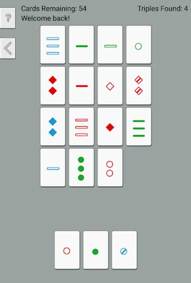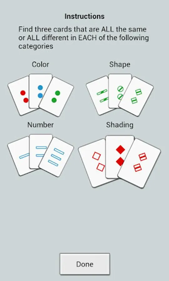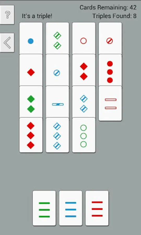Cards form a triple if their color, shape, number, and shading are all the same or all different.