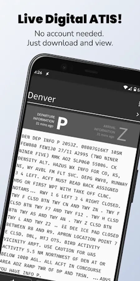 Disclaimer: ATIS App should not be used as a flight planning tool. No warranty is implied or guaranteed as to the accuracy of the provided information. Plan flights using only FAA approved tools. Use of this app implies consent to this disclaimer.